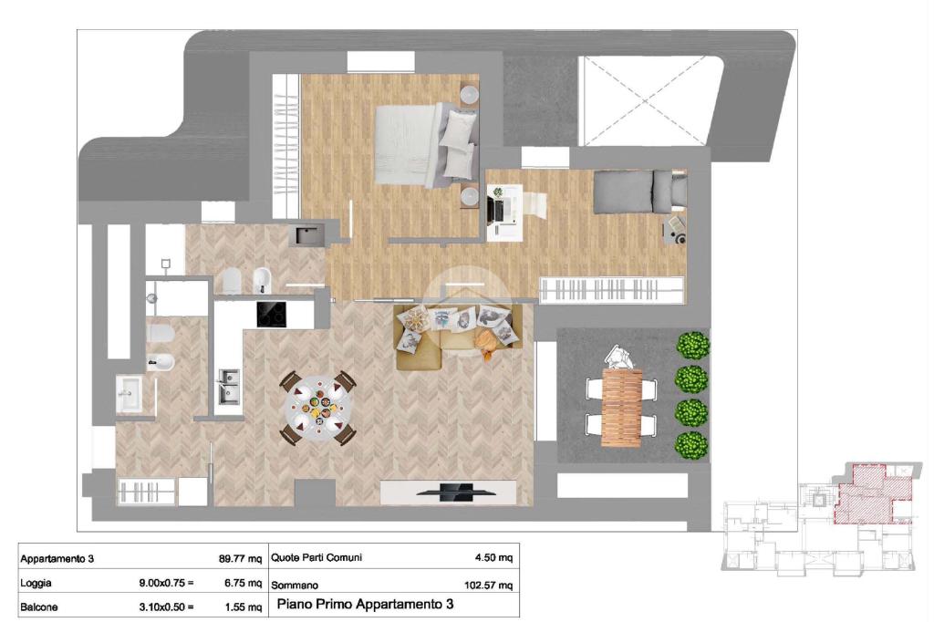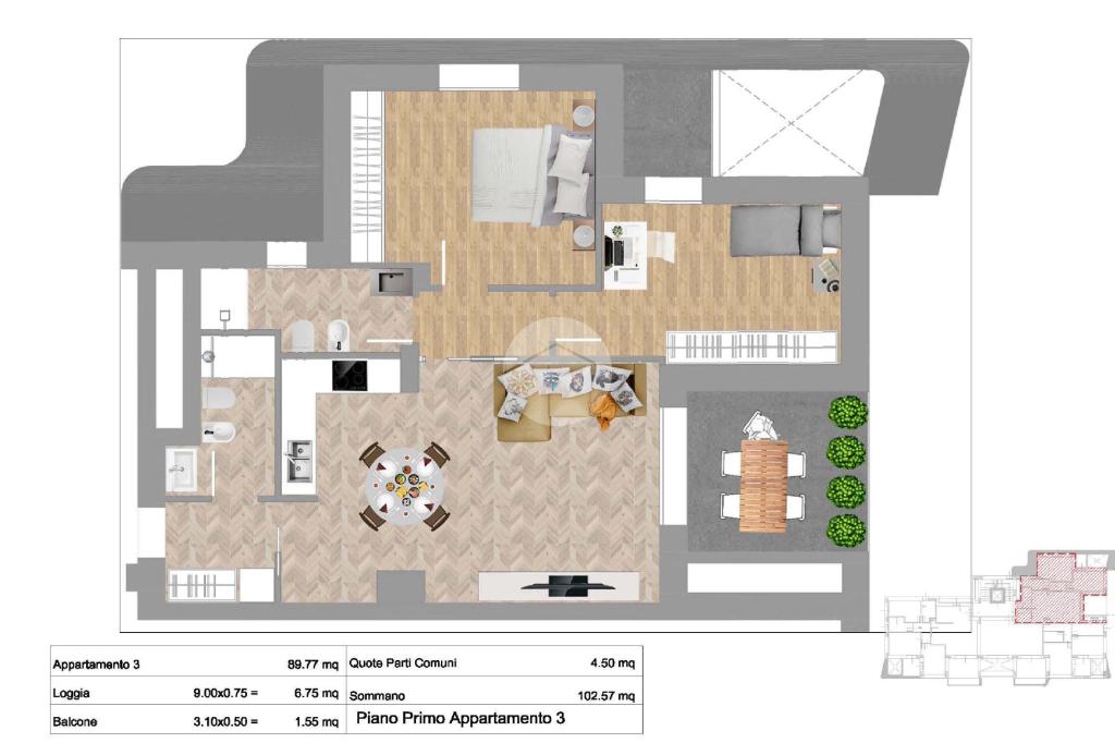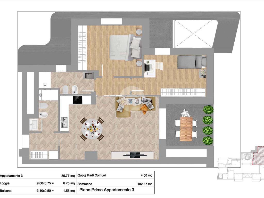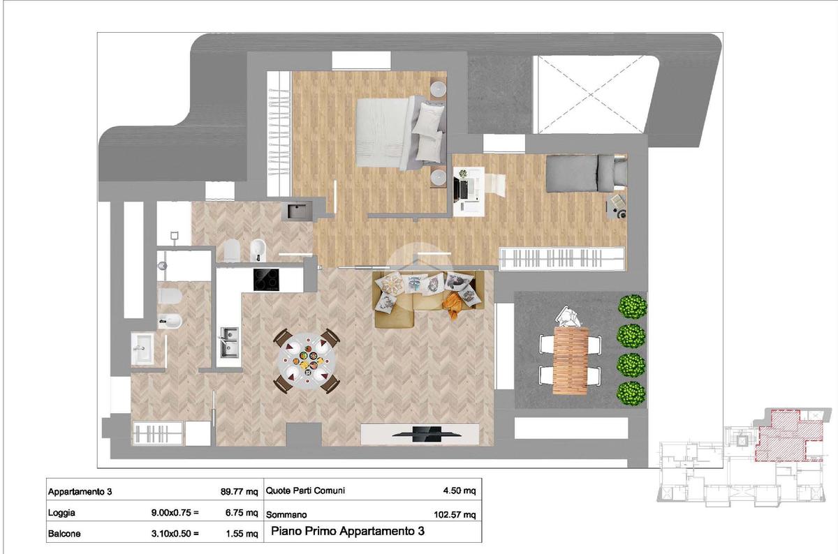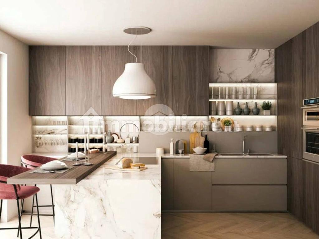 Il soggiorno con cucina a vista rappresenta il cuore della casa, un open space moderno e luminoso, perfetto per la convivialità. Questa zona si affaccia su una loggia di 9 mq, ideale per trascorrere momenti di relax all’aperto o pranzare durante la bella stagione.