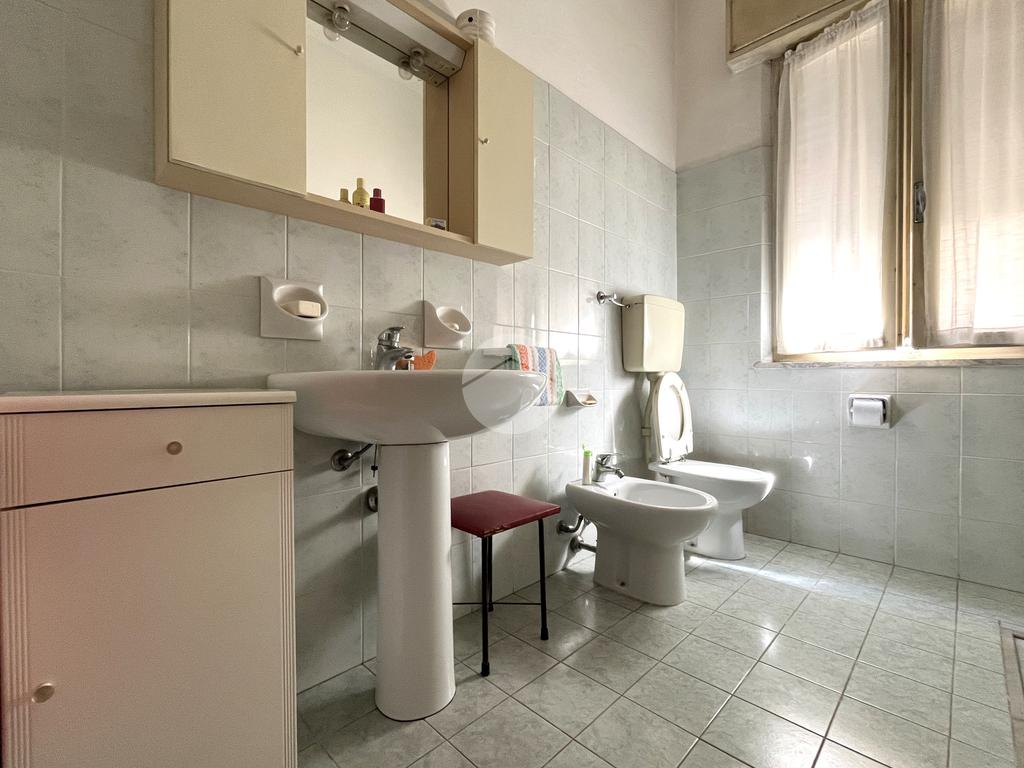 La zona notte è composta da due camere da letto matrimoniali, entrambe di dimensioni generose. La prima camera è orientata verso il fronte dell’abitazione, mentre la seconda si trova in posizione più riservata, con affaccio laterale. Tra le due camere si trova un bagno finestrato, facilmente accessibile da entrambi gli ambienti.