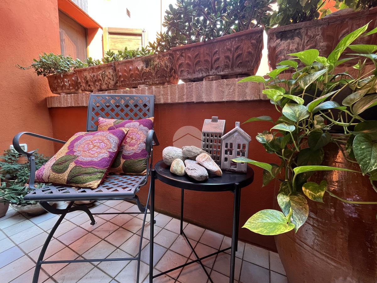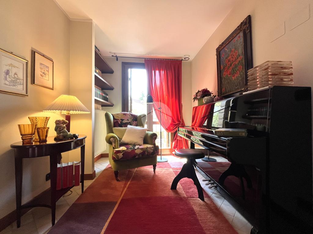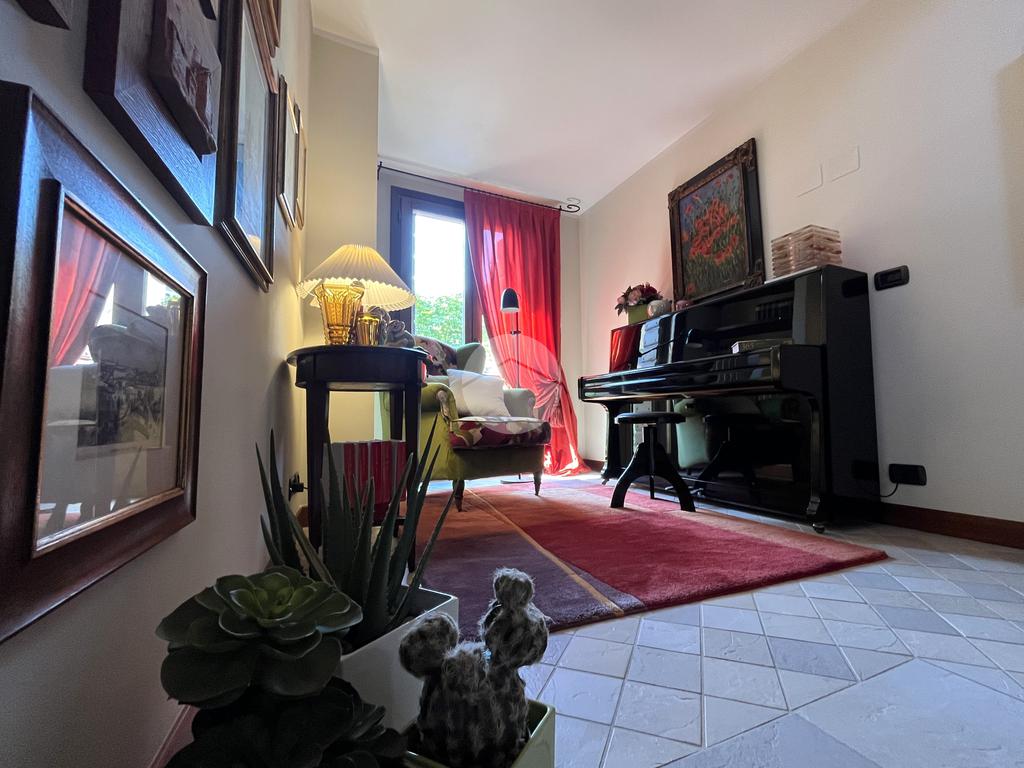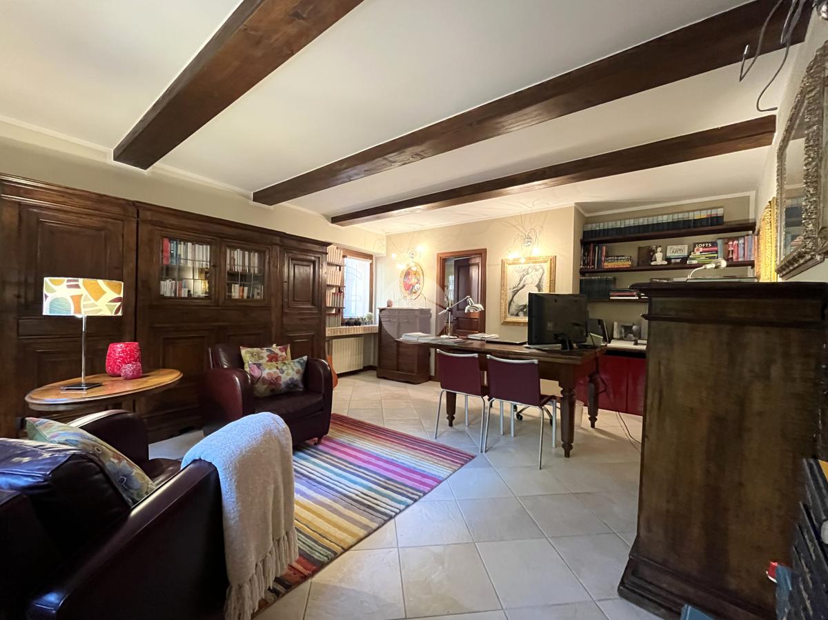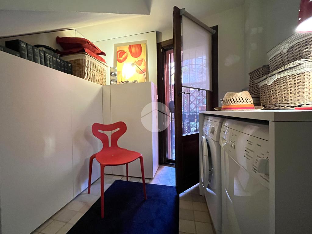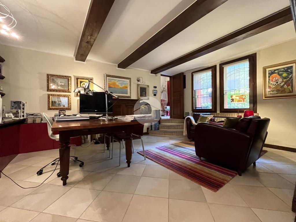 Al piano terra l’ingresso si apre verso il giardino laterale, uno spazio verde che crea una piacevole zona di accoglienza e permette di vivere l’esterno anche in un contesto storico. Varcata la soglia, si accede a un ambiente studiato per essere versatile: uno studio con bagno privato, perfetto come ufficio professionale, stanza per ospiti o ambiente dedicato allo smart working. Sullo stesso livello si trova anche la lavanderia, dotata di accesso diretto alla corte interna, un’area esterna riservata che aggiunge praticità e permette di gestire le funzioni di servizio in maniera discreta. Completa il piano il garage collegato internamente, un elemento particolarmente prezioso in centro storico, dove gli spazi per la sosta sono limitati.