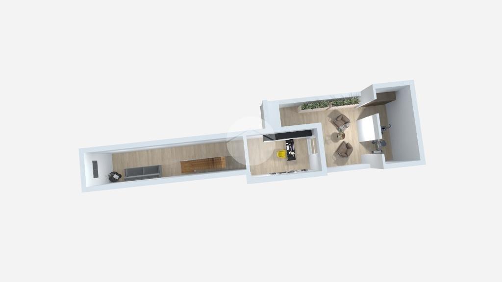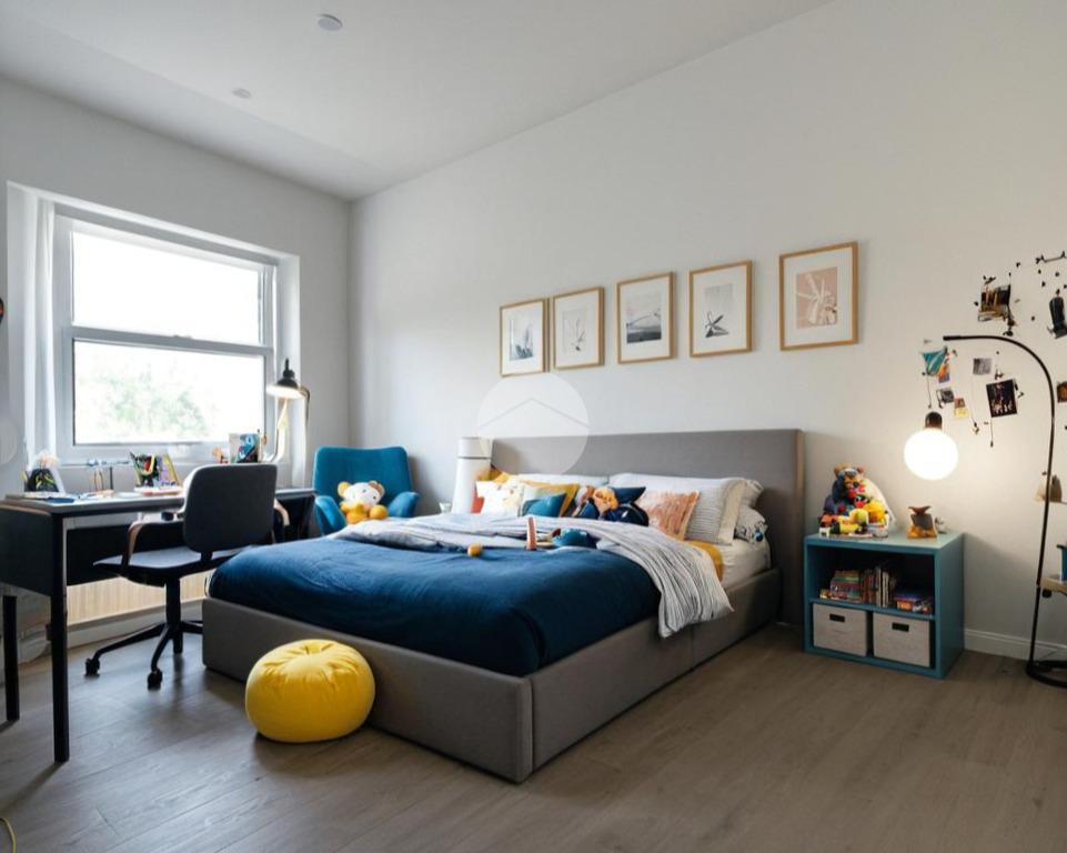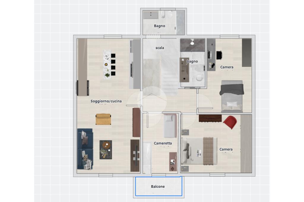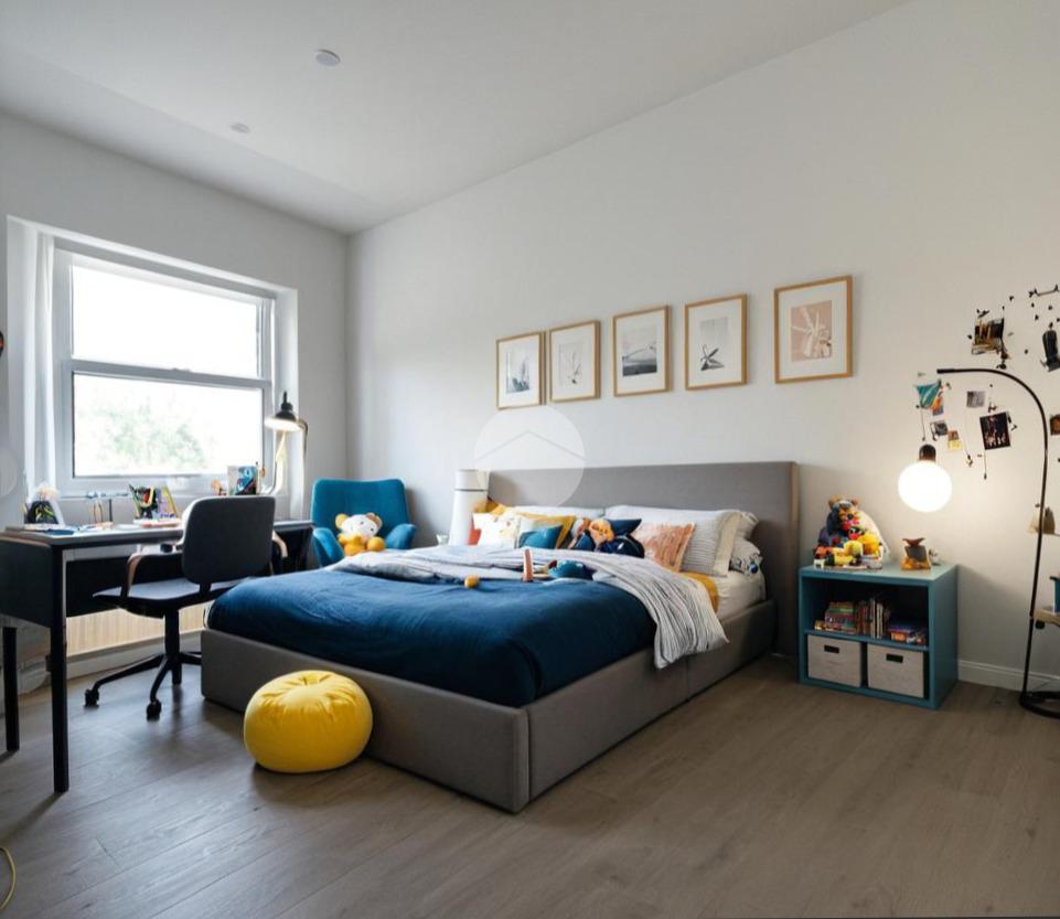Il primo piano rappresenta il cuore dell’abitazione. Il soggiorno è ampio e particolarmente scenografico, con altezze che arrivano fino a circa 4,55 metri, caratteristica che dona grande respiro agli ambienti e permette soluzioni architettoniche moderne come soppalchi, travi a vista o illuminazione verticale. La cucina è separata, quindi più funzionale per chi preferisce ambienti distinti. La zona notte è composta da due camere da letto con altezze generose, uno studio utilizzabile anche come terza cameretta e due bagni, configurazione ideale per una famiglia. È presente anche un balcone che aggiunge sfogo esterno alla zona giorno.